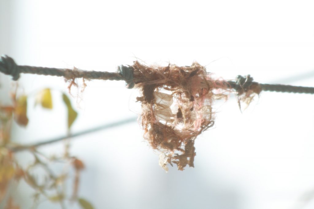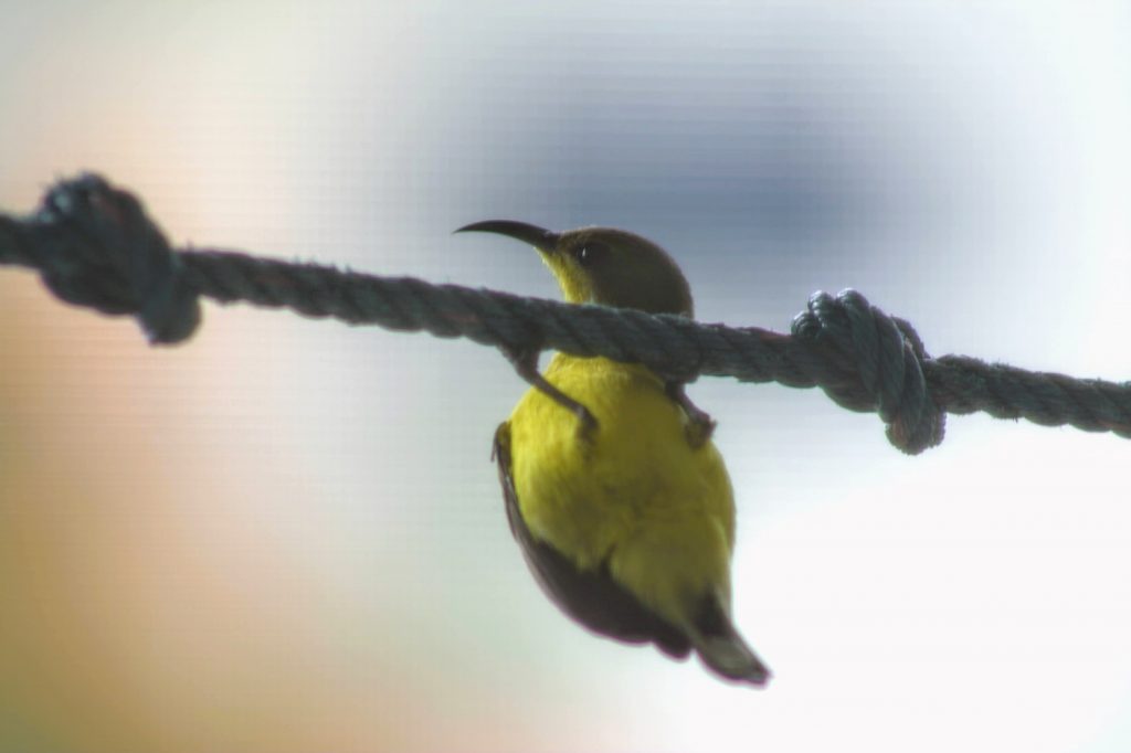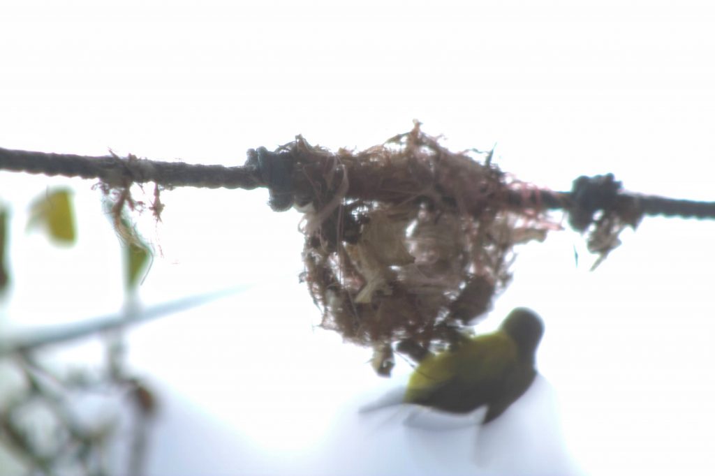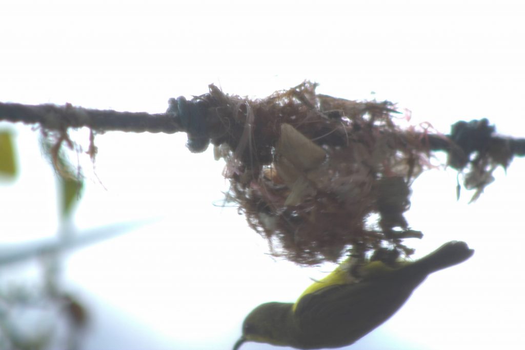 Sunbirds build a hanging nest out of spiderwebs and, in this case at least, plastic raffia.
